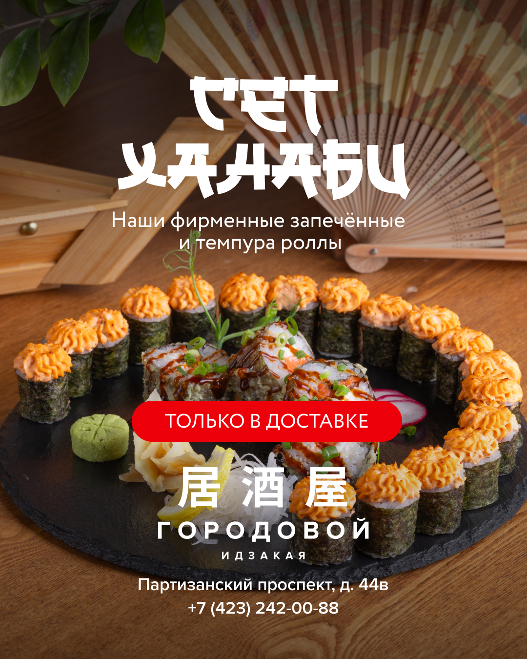 •Сет «Ханаби» — для фанатов запеченной шапочки и хрустящей темпуры. В составе: три вида запеченных роллов и аппетитный темпура ролл с форелью.